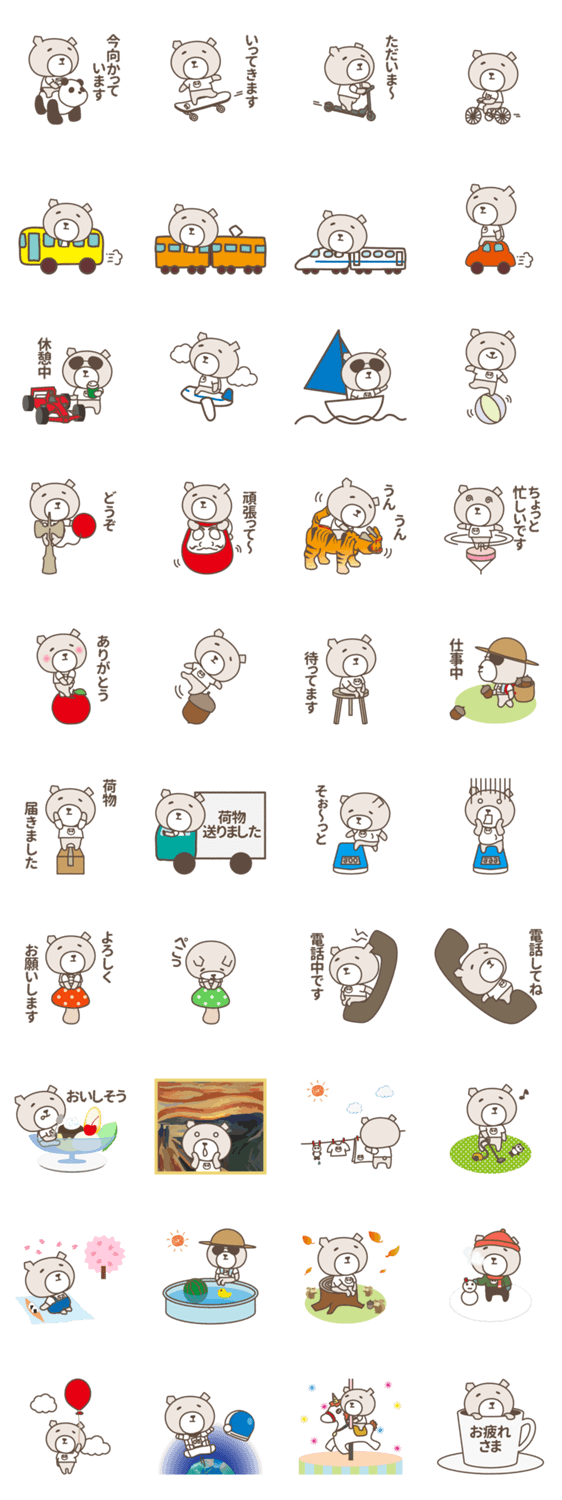 時々サングラスを掛けてパンダになったつもりになるかわいいクマのスタンプ ダルマやけん玉、スケボーやバスや新幹線色んなものに乗っていますお揃いの絵文字も使ってね〜