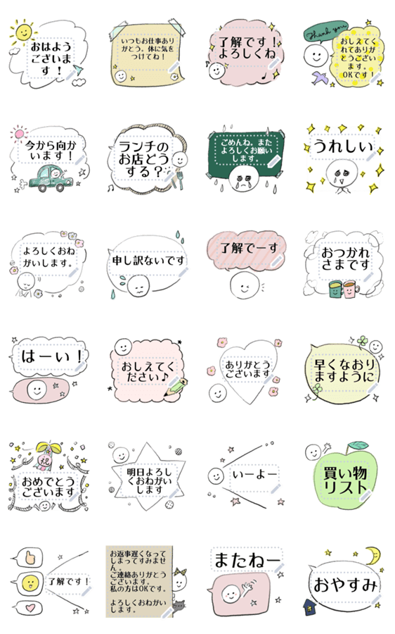 どんなセリフでも入りやすいように作りました。色も落ち着いたものを多めにしたので丁寧な場面から気軽な場面まで広く使えます。 現在この商品は一部のスマートフォン版LINE 10.3.0以上のトークルームでのみ使用できます。動作環境の最新情報はヘルプをご確認ください。