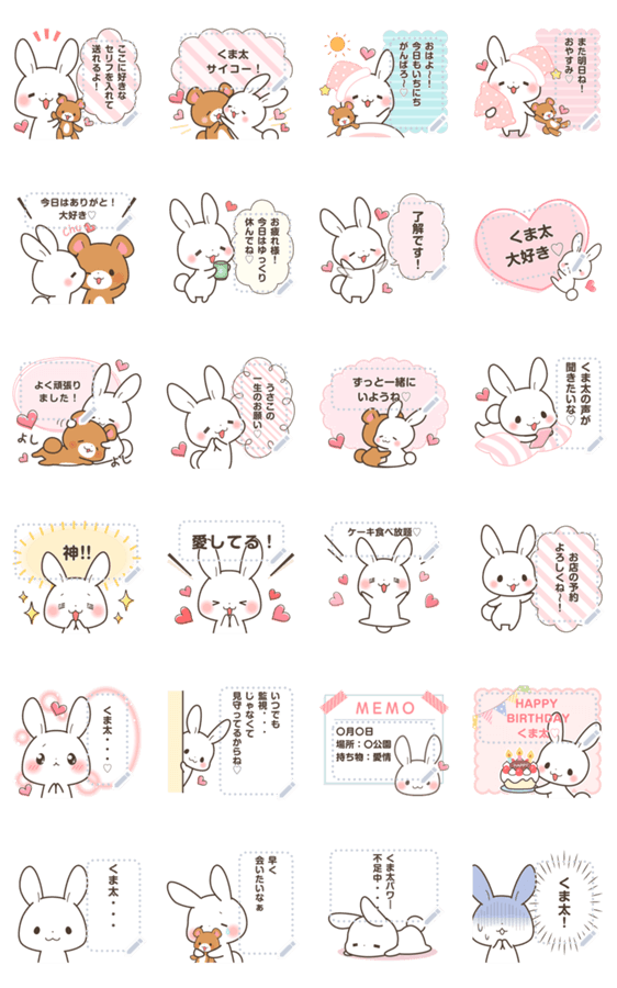 | スタンプ説明 | 自由にメッセージの書き換えができる!恋人や夫婦、カップルのためのメッセージスタンプです♪ 現在この商品は一部のスマートフォン版LINE 10.3.0以上のトークルームでのみ使用できます。動作環境の最新情報はヘルプをご確認ください。 |