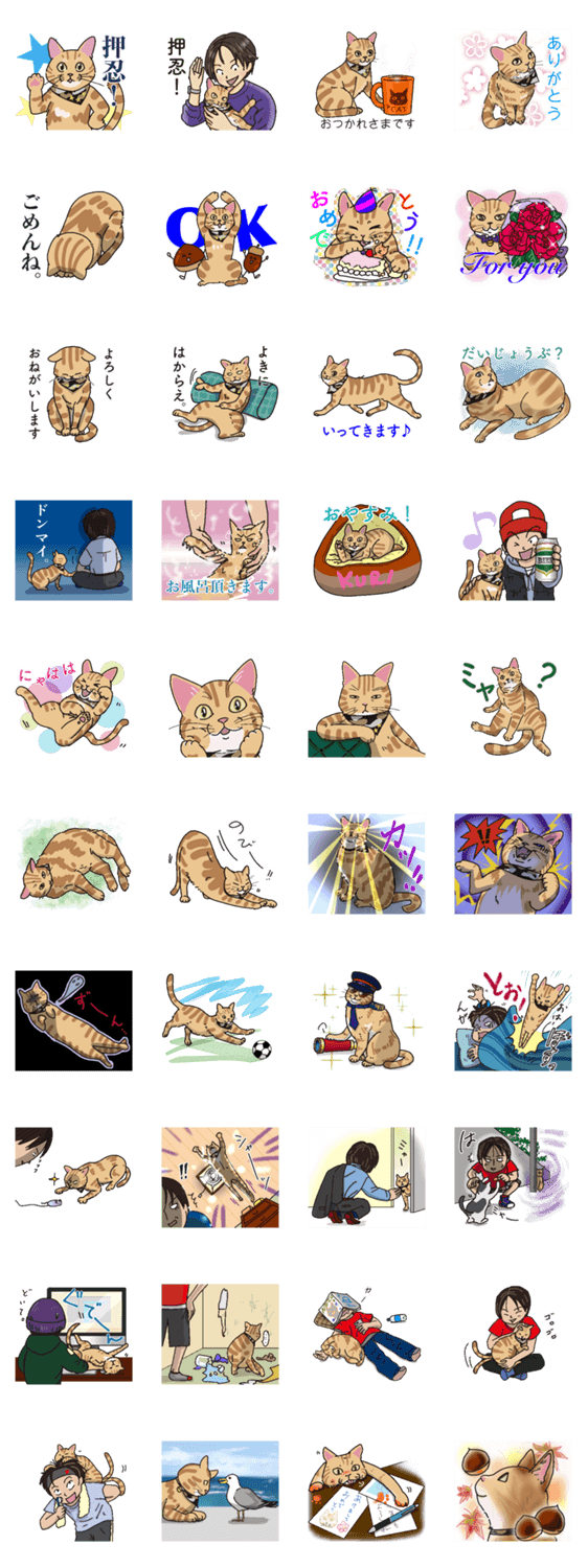 猫の栗と、「押忍!」が口癖のご主人のけいちゃんとの、ほのぼのした日常を描いたスタンプ。