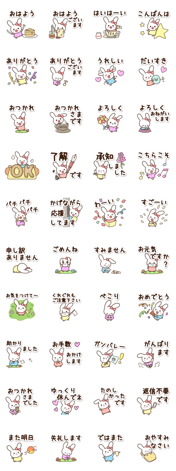 リボンをつけた、可愛いうさぎスタンプです。敬語や丁寧な言葉、よく使う言葉を集めました。どなたにでも使えるスタンプです。ウサギ好きな方にぜひ。【かたこ】