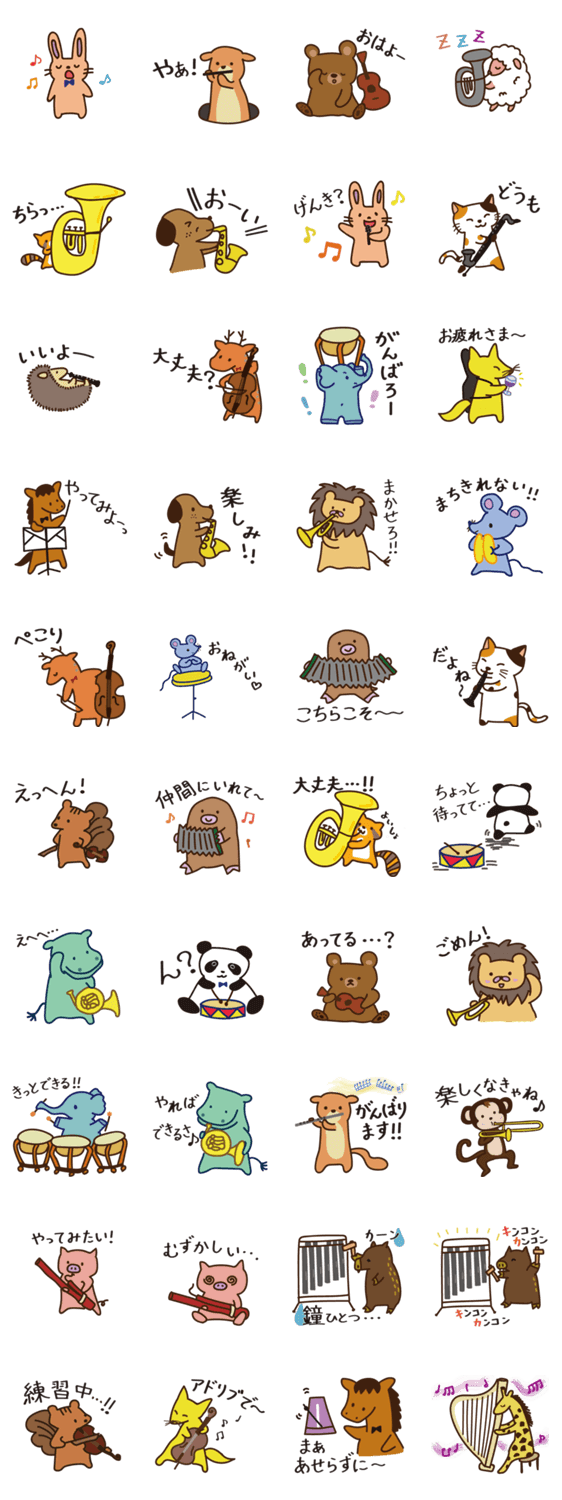 | スタンプ説明 | マイペースな動物たちの音楽隊。どんな演奏になるのでしょう…? |