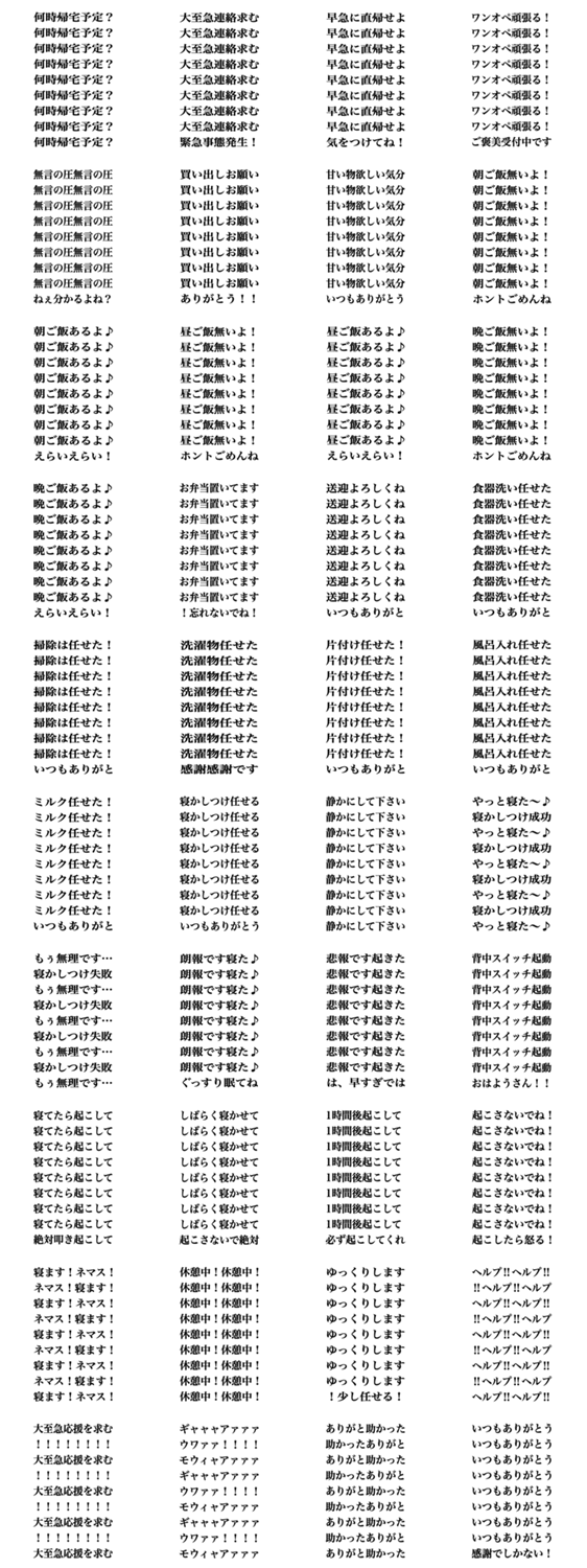 今は「手抜き育児」が主流!!ママがパパがストレスを溜めないように、家事と育児を適度にするための連絡用スタンプ。 家族連絡用/伝わる/超長文/デカ文字BIG ※このスタンプはトークルームで大きく表示されるBIGスタンプです。