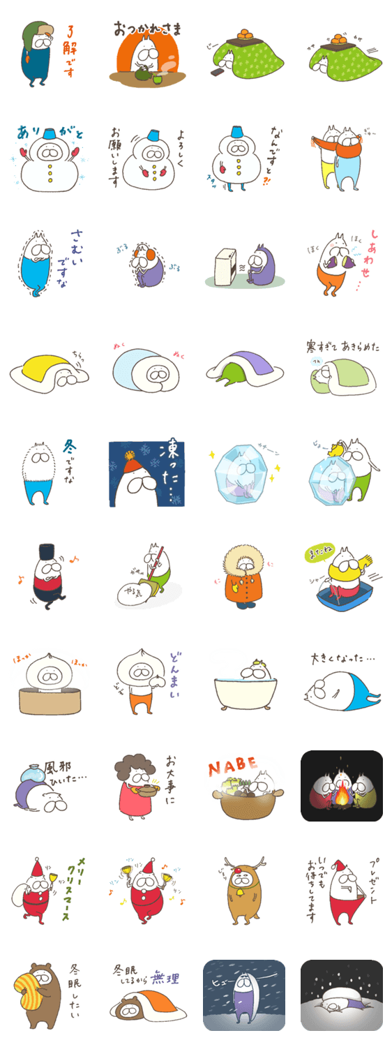 ねこタイツの冬をテーマにしたスタンプです。布団にもぐってみたり、時には雪に埋もれたりしながらねこタイツたちと一緒に冬を楽しみましょう。クリスマススタンプ付き。