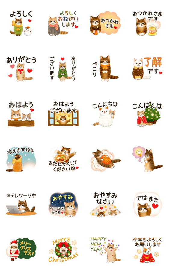 猫たちのイラストに、友だち同士で使えるものから敬語まで、普段よく使うメッセージを添えました。冬に使いやすいものが多めのセットです。クリスマスやお正月にも。
