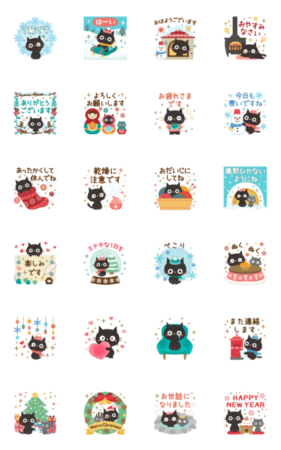 | スタンプ説明 | 黒ねこシリーズ第10弾!毎日使える冬のほっこり定番スタンプです♪挨拶、ナチュラル、北欧、メリークリスマス、年末年始、お正月、黒猫 |