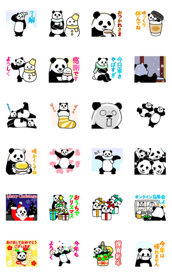 | スタンプ説明 | パンダンの冬の動くスタンプ第4弾。年末年始、お正月、クリスマスも少し入ってます |