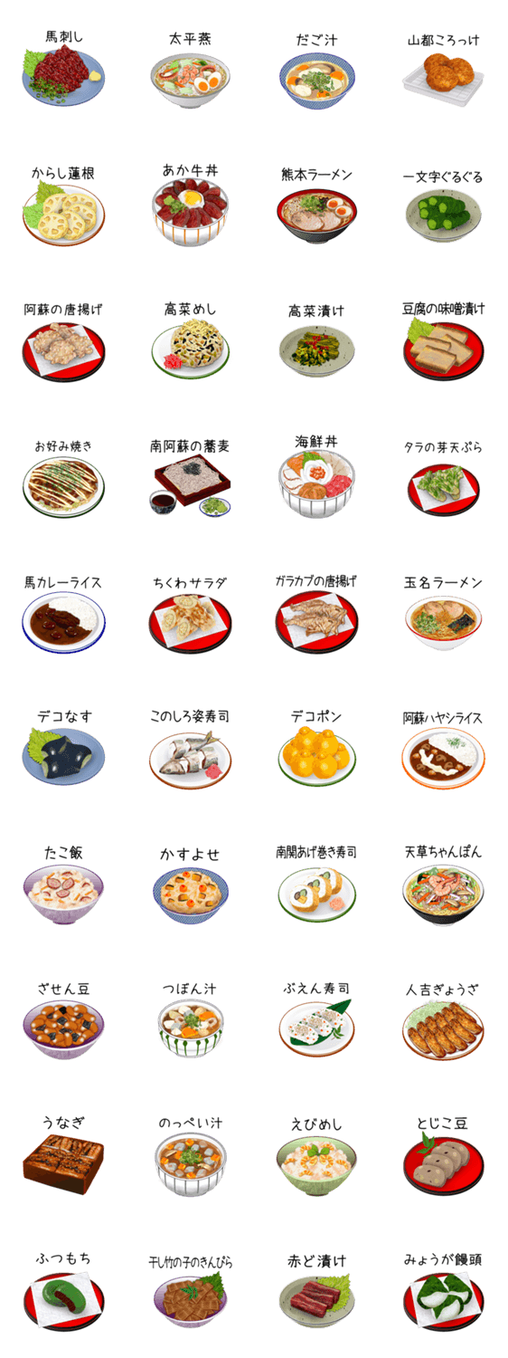 | スタンプ説明 | 熊本の料理はうまかけん!馬刺し、だご汁、辛子れんこん、熊本ラーメン、一文字ぐるぐる、たこ飯、太平燕などなど、熊本の人気料理から郷土料理を食べ尽くし! |
