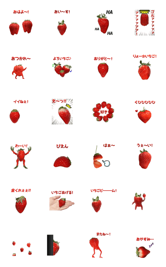 イチゴの写真で作った動くスタンプです。かわいい苺がキモ可愛く激しくぬるぬる動きまくります。いちご、フルーツ、ストロベリー、果物。実写食べ物スタンプシリーズ。