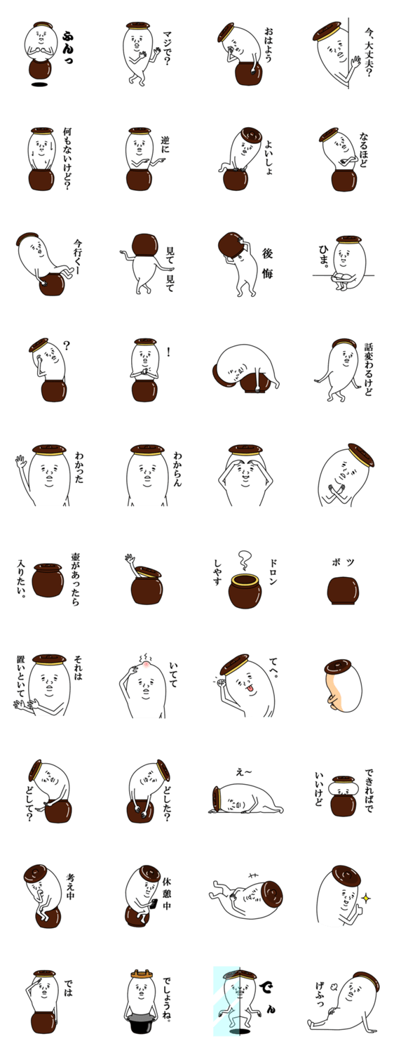 ぬか漬け壺が気に入って住み着いている謎の生命体。日常会話で何かと使えるキモかわ系スタンプです。