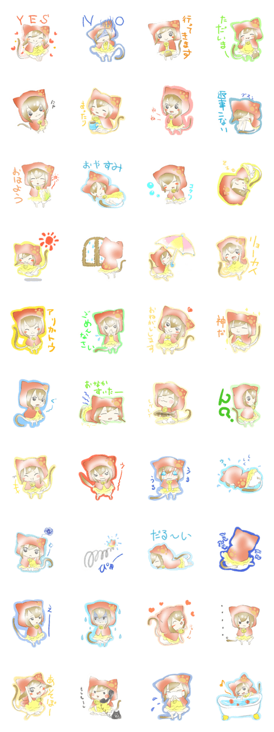 ねこみみのついた赤いずきんを被った女の子!尻尾も生やして、気分は完全ににゃんこなのだっ!日々の会話で使う言葉を、ねこずきんが体を張って表現してるよ♪
