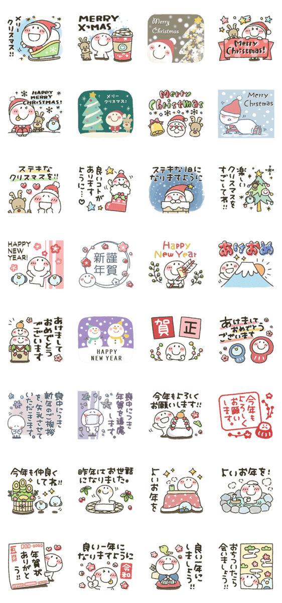 まるぴのスタンプ第80弾!クリスマスからお正月まで使えるスタンプです。年賀状代わりに今年もよろしくお願いします。喪中、賀正、令和、良いお年を、メリークリスマス