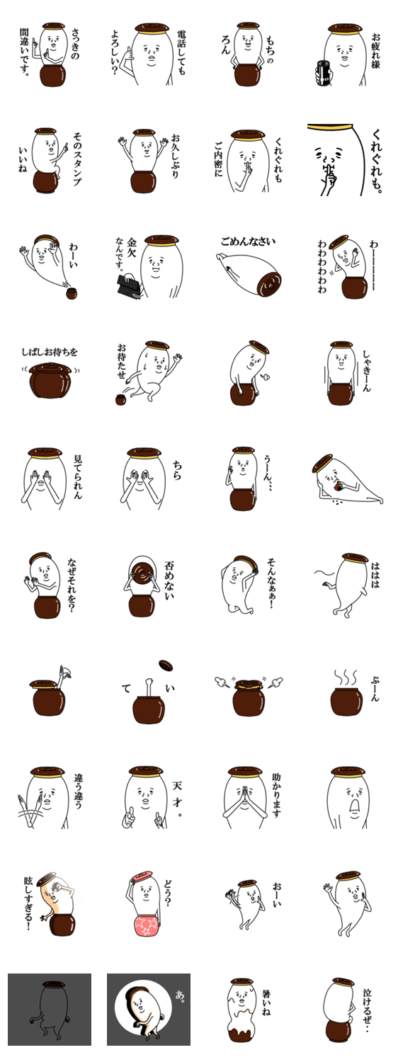 ぬか漬け壺の住人「壺一郎」の第二弾。日常会話で何かと使えるキモかわ系スタンプです。