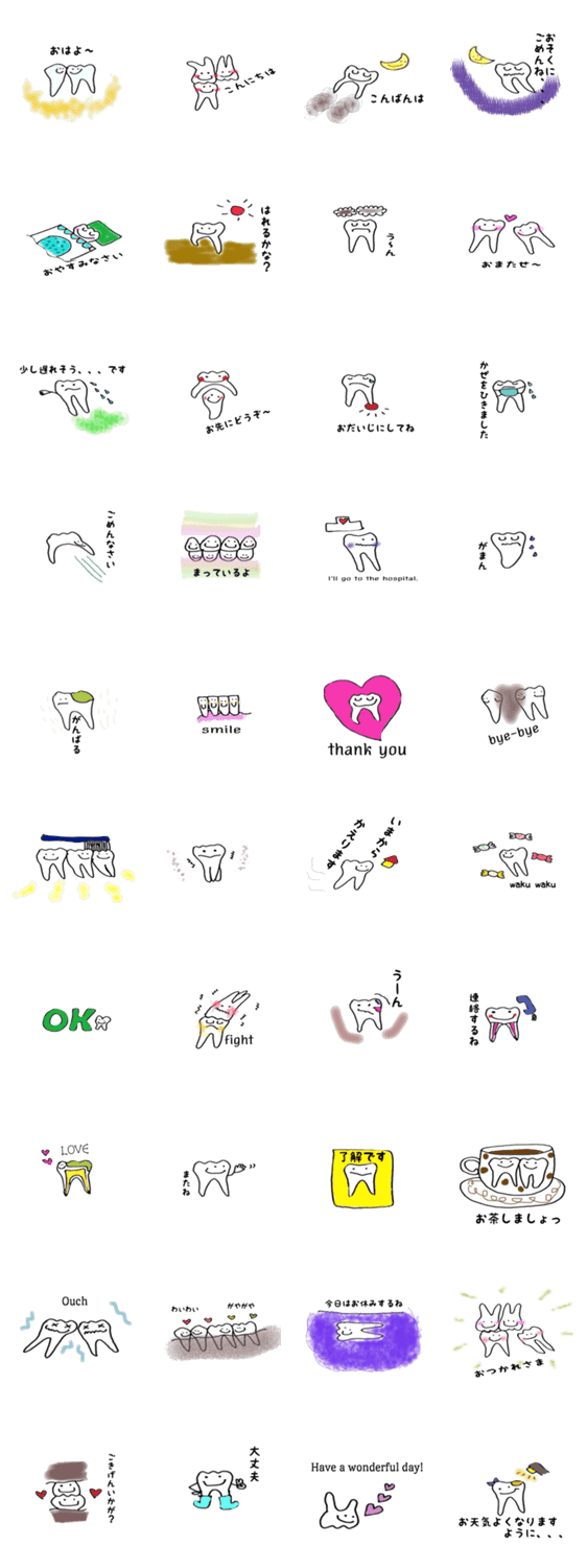 毎日の生活に使いたいなと思うものをスタンプにしてみました。歯に関わる仕事や勉強をしている方からそうでない方までみなさまに愛されるスタンプでありますように。