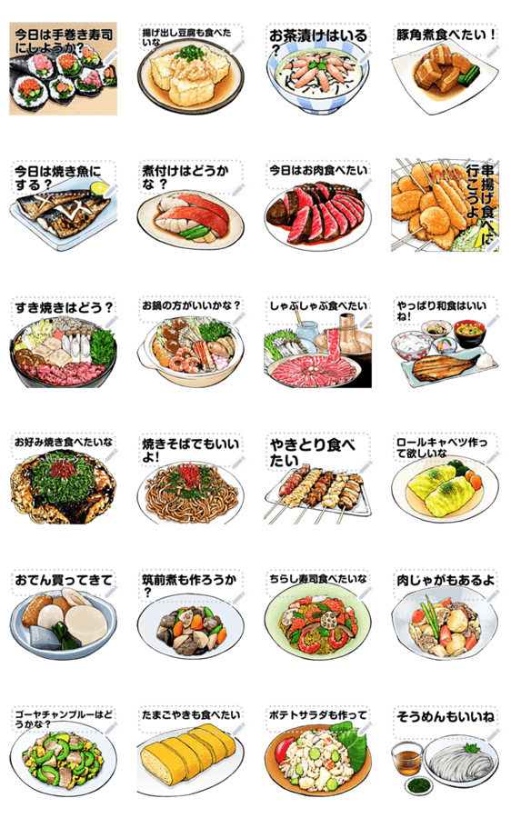 ご飯何にしよう?何食べたい?何作る?食べたい物を考えたり 献立の参考にもなる ごはん 食べ物 料理のメッセージスタンプ第2弾です。 文章を自由自在に入れる事ができます 現在この商品は一部のスマートフォン版LINE 10.3.0以上のトークルームでのみ使用できます。動作環境の最新情報はヘルプをご確認ください。