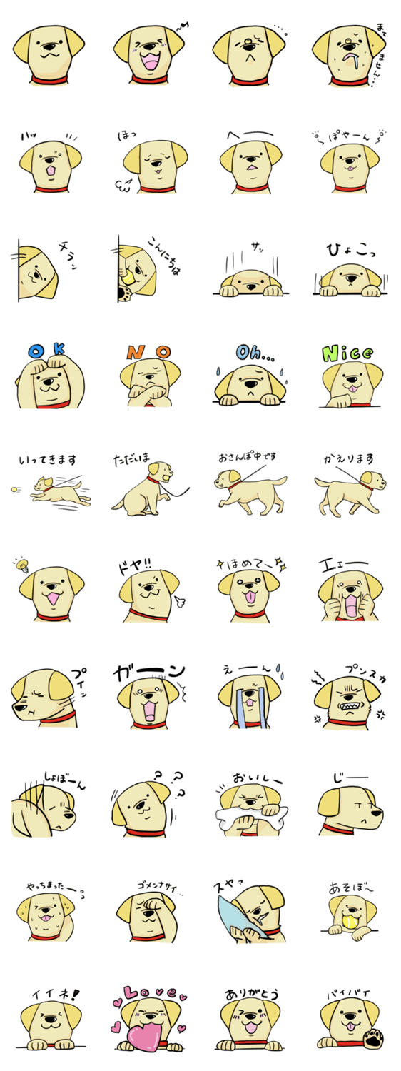 ラブラドールのアストンくんです。ラブ好き、犬好きの皆様にぜひ!普段のやり取りで使いやすい日常会話から、表情豊かなリアクション系まで、色々なシーンに使えます。