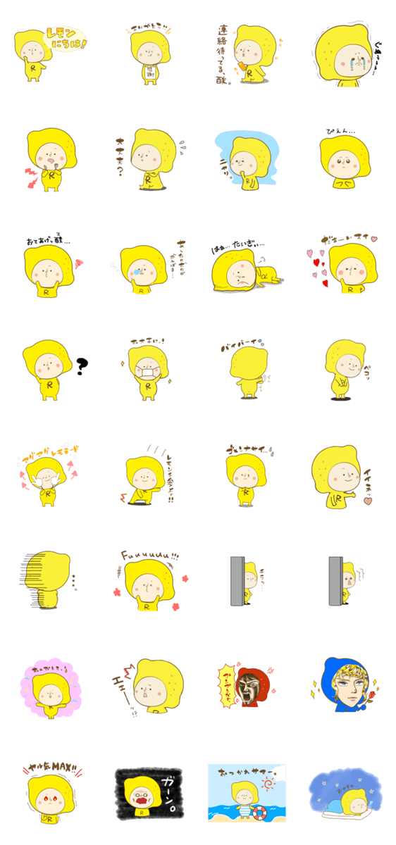 | スタンプ説明 | RCCイマナマ!キャラクター「レモナルド・レモンチ」のいろんな表情が楽しめるレモンチスタンプです! |