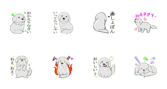 | スタンプ説明 | キュートなふわふわもふもふワンコのスタンプです。 使いやすい言葉をセレクトしました。 |