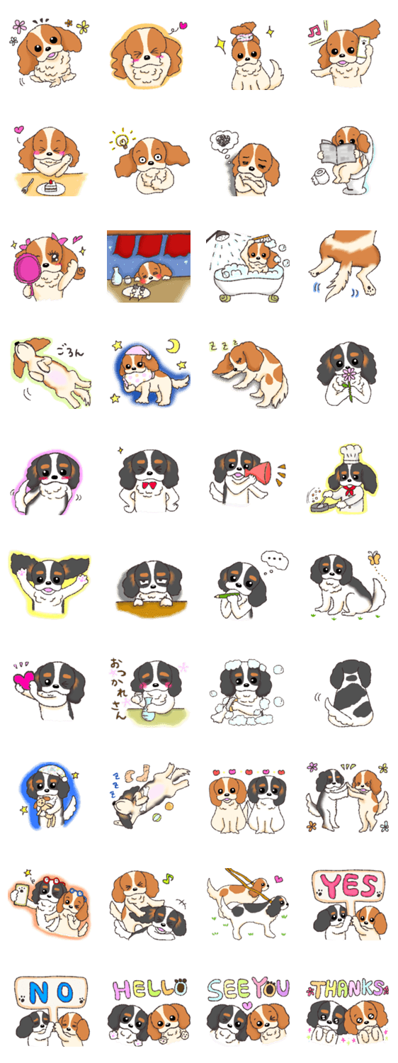 キャバリアちゃん好きさんのためのキャバリアちゃんスタンプです。 ブレンハイムとトライカラーの2種が登場するバージョンです♪