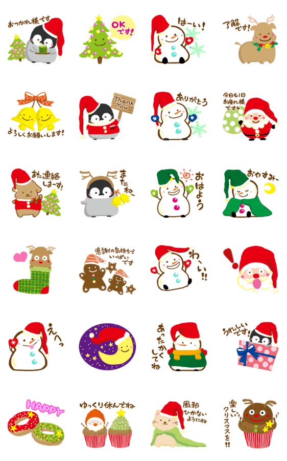 クリスマスシーズンに使えるスタンプです。スノーマンやペンギン、サンタクロース等のかわいいキャラクターが登場!