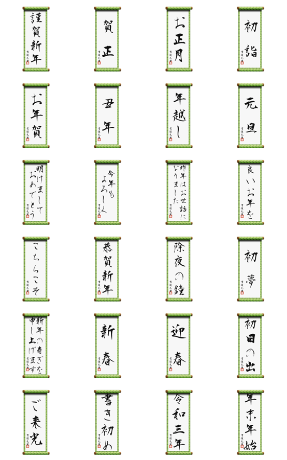 日本の掛け軸に習字で書いたようなデザイン。和風の巻物を思わせます。年末年始、お年賀用です。 ※このスタンプはトークルームで大きく表示されるBIGスタンプです。