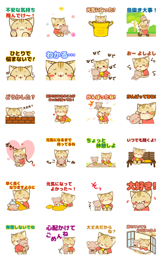 優しく寄り添うすずにゃんのポップアップスタンプです。 今回はすずにゃんが拾ったくまのぬいぐるみ「くまにゃ」登場。すずにゃんワールドに連れて行ったら動き出したよ