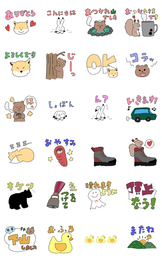 登山テイストながら、日常生活でも使いやすい動物スタンプです。 山ガール、山ボーイはもちろん、動物好きにもおすすめ! くま、きつね、うさぎさん好きの人、あつまれー♪