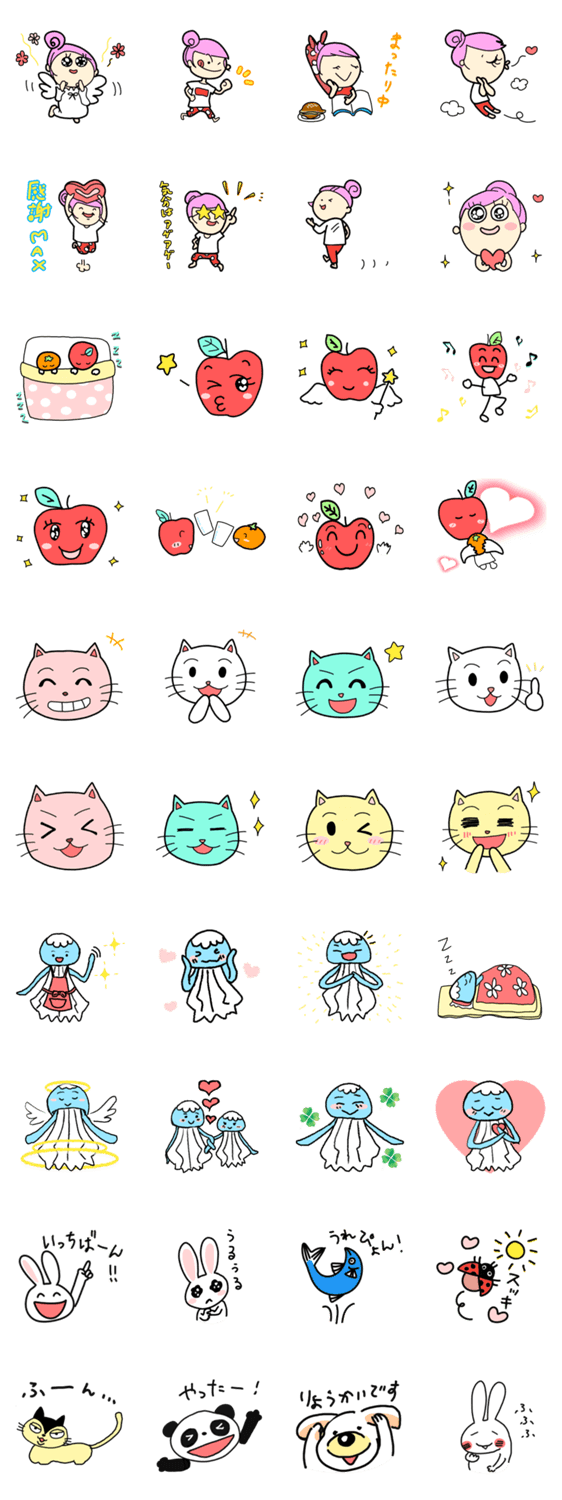 | スタンプ説明 | 毎日たのしいだんごちゃん りんごちゃんとみかんくん ハッピースマイルにゃーこ 水色クラゲのぷーちゃん プリティアニマルズ |