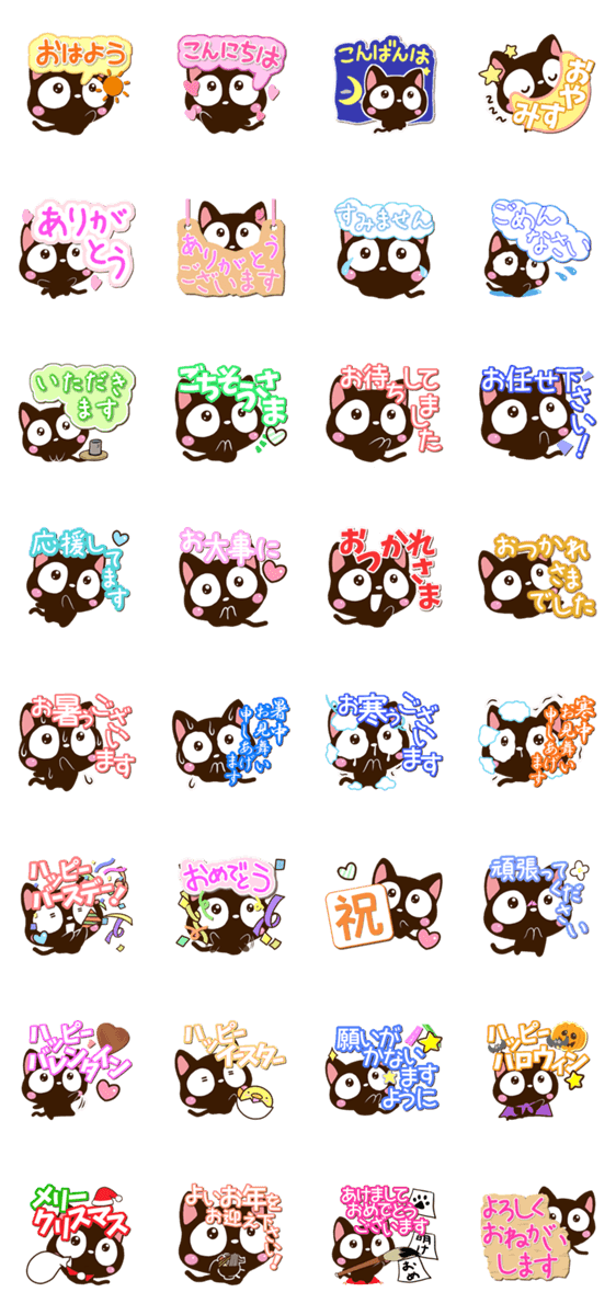 『小さい黒猫スタンプ』の【あいさつ編】になります。小さな黒ねこが、一年中のあいさつをします。猫好きな方にぜひ。【かたこ】
