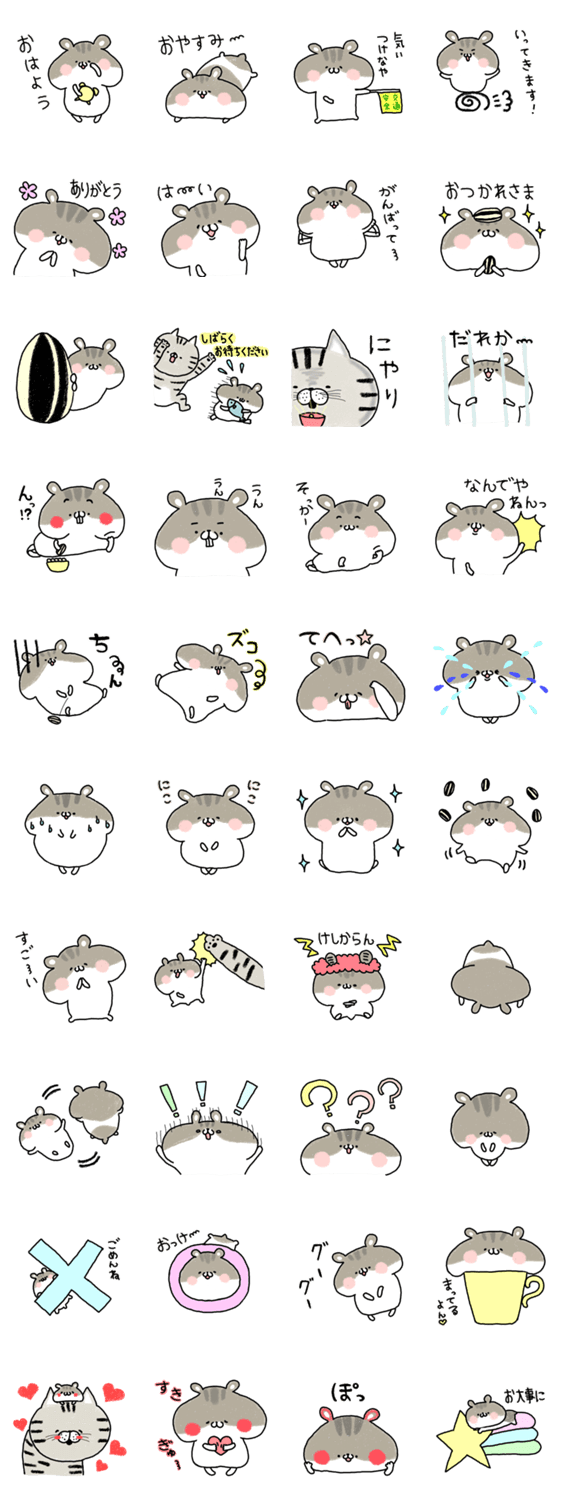 ぼてっとしたかわいいハムスターのスタンプです。クレヨンをつかってふわふわ、もこもこ。ジャンガリアンです。ねこ(アメショー)もついてきます。二匹は仲良しです。