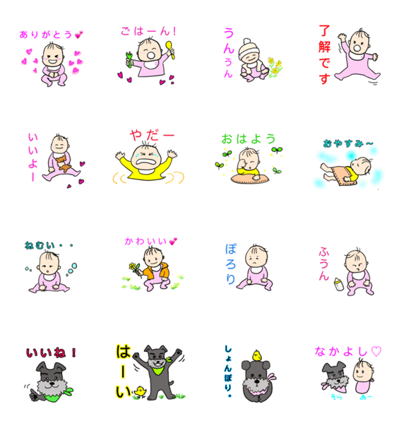 赤ちゃんのあーちゃんスタンプ◎ミニチュアシュナウザーのそらくんも一緒♪