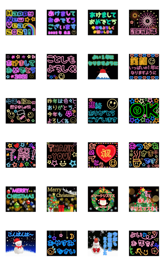 2021年リニューアル版です。送る相手の画面がどんな色でも見やすい黒背景にピカピカのネオン。クリスマスやお正月の年賀状代わりの挨拶、日常使える言葉をセットにしました