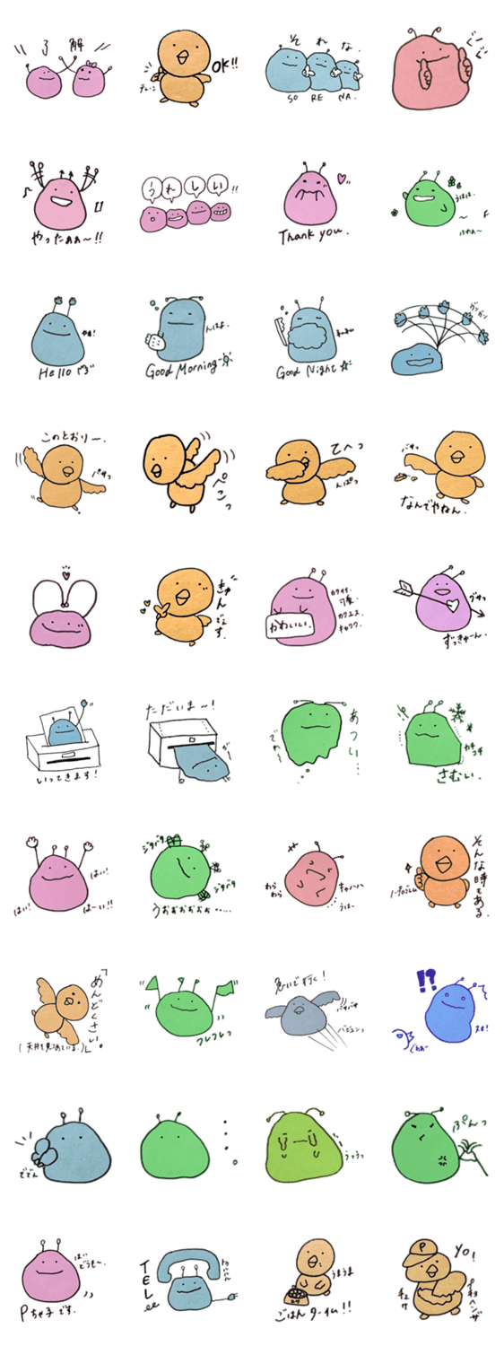 パちゃ子かポちゃ子かペちゃ子でもいいな、まるまるぷよぷよなスタンプ。そんなPちゃ子は気分で色が変わるみたい、友達のトリも。
