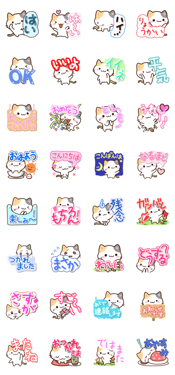 『小さい三毛猫』スタンプから『基本』編になります。基本的な言葉や、丁寧な言葉を集めたスタンプです。三毛猫好きな方にぜひ。【かたこ】