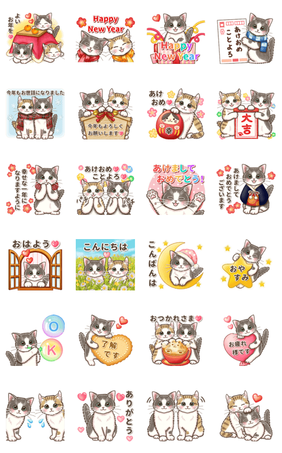 やさしい子猫たちが画面いっぱいにとびだすポップアップスタンプです♪年末年始のあいさつと日常会話に使いやすい基本の言葉が入っています♪※あけおめスタンプ2021の対象です。対象スタンプまたは絵文字を購入するとLINEおみくじを引けます。