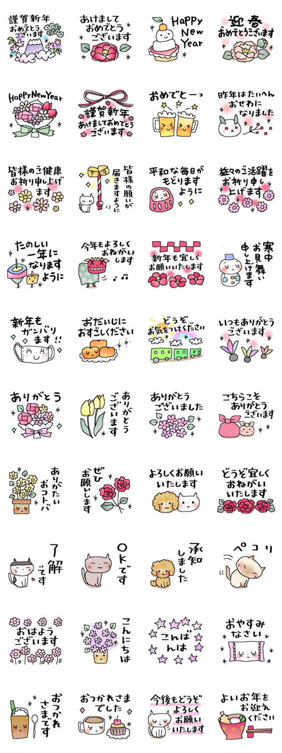ずっとお使い頂ける年末年始のご挨拶スタンプ。シンプルで見やすくて使いやすい大人かわいい40個。日頃の感謝の気持ちが伝わります。花いっぱい、ゆるっと癒し系です。