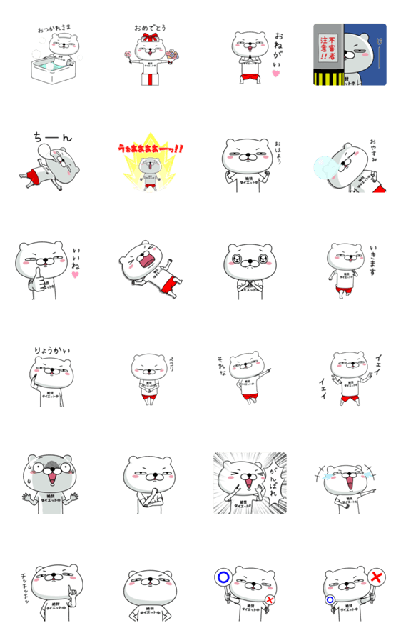 | スタンプ説明 | ダイエット中の方におすすめ。「絶賛ダイエット中」Tシャツを着たクマのスタンプです。おしゃTくまは動くんです❤ |