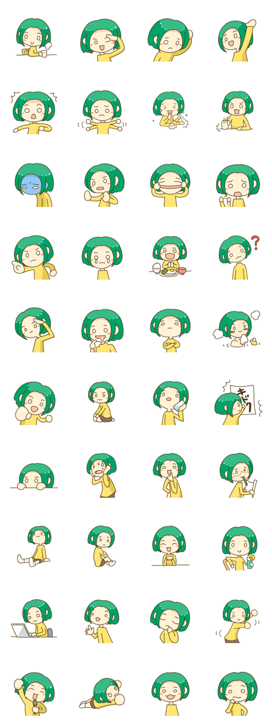 ほんわか癒し系の、緑髪の女の子のスタンプです。