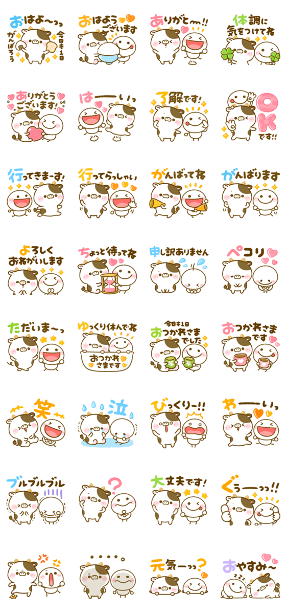 棒人間と牛さんの毎日使えるカラフルカラーのスタンプです。