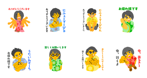 会社の上司や同僚にも使用できるフォーマルな沖縄の人々のスタンプ。ようこそ沖縄へ、さあ沖縄方言を使ってみよう。