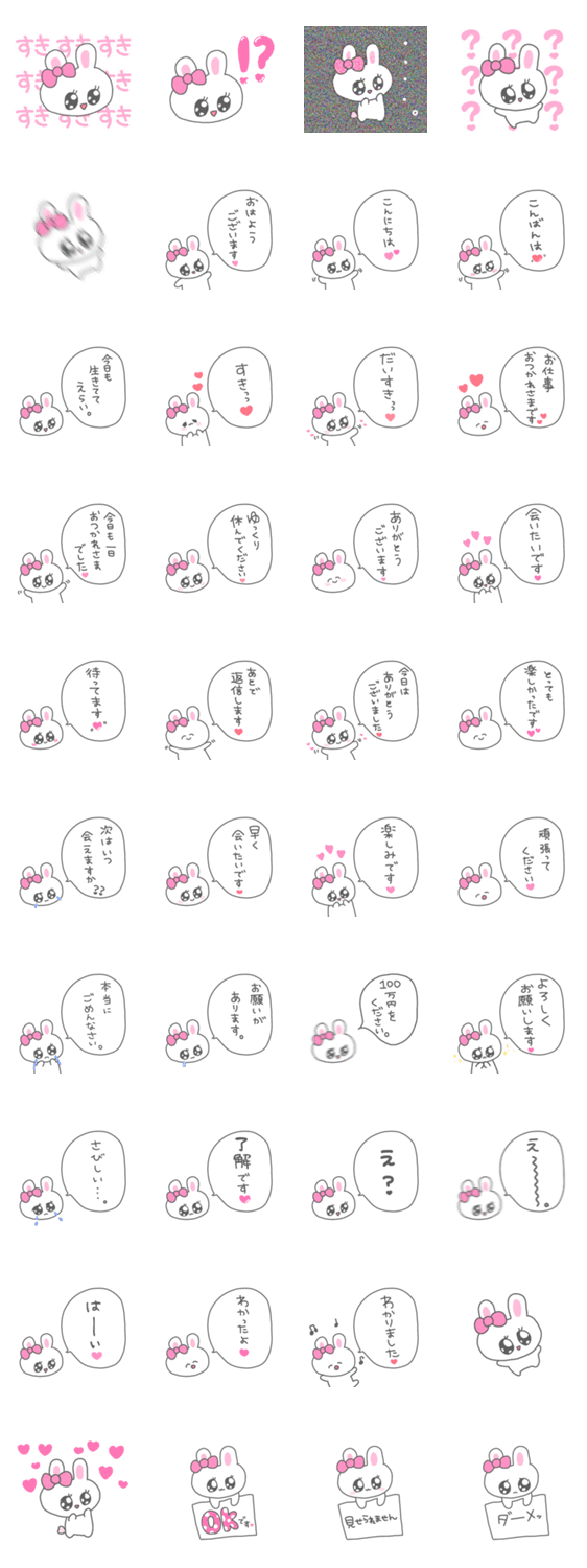| スタンプ説明 | お目々がうるうる、リボンうさぎのうるうさちゃんだよー! |