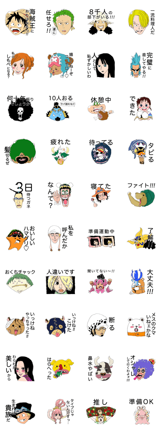 ルフィ/ゾロ/ウソップ/サンジ/ナミ/チョッパー/ロビン/フランキー/ブルック/ジンベエ/リカ/カルー/ボンクレー/エース/ペローナ/ロー/ペボ/ハンコック/サボ/しらほし/他