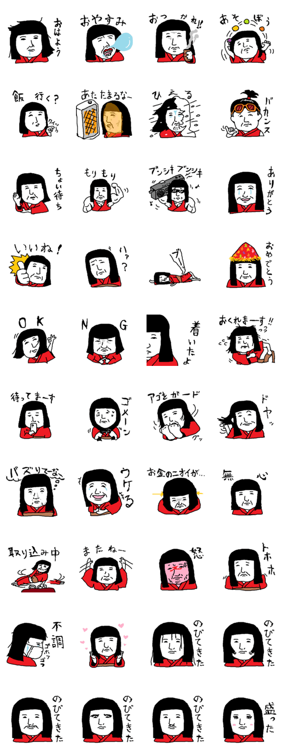 ちょっと怖い日本人形を楽しいスタンプにしました。ビックリするほどバズらない気がするスタンプです。