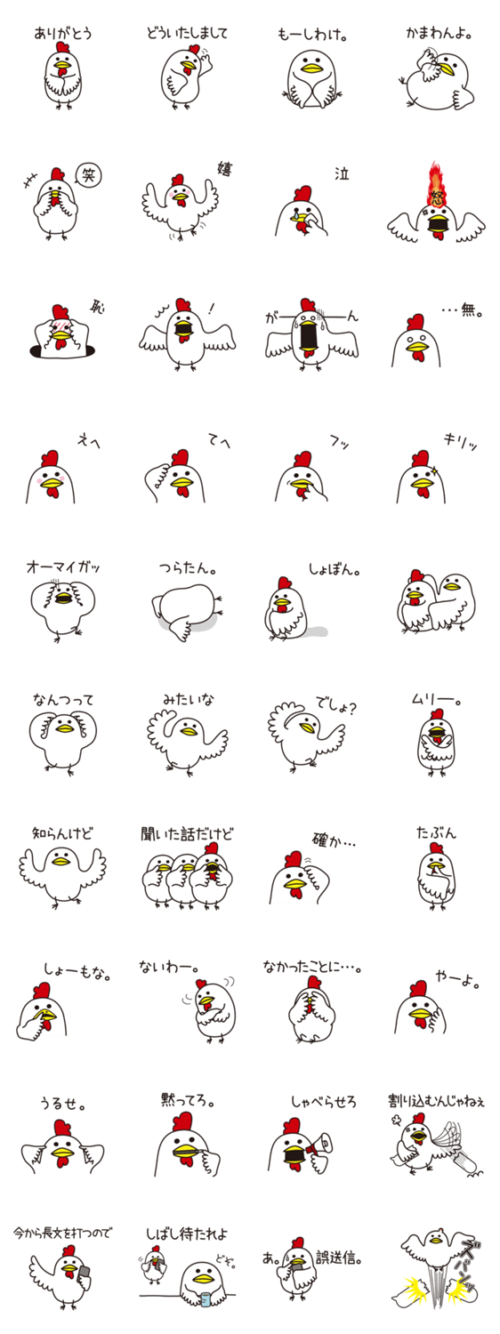しろたさんシリーズのスタンプに時々登場するニワトリと白い鳥が主役のスタンプ第2弾。ちょっと口は悪いけど、実は意外と友情に厚いトリさん達です。