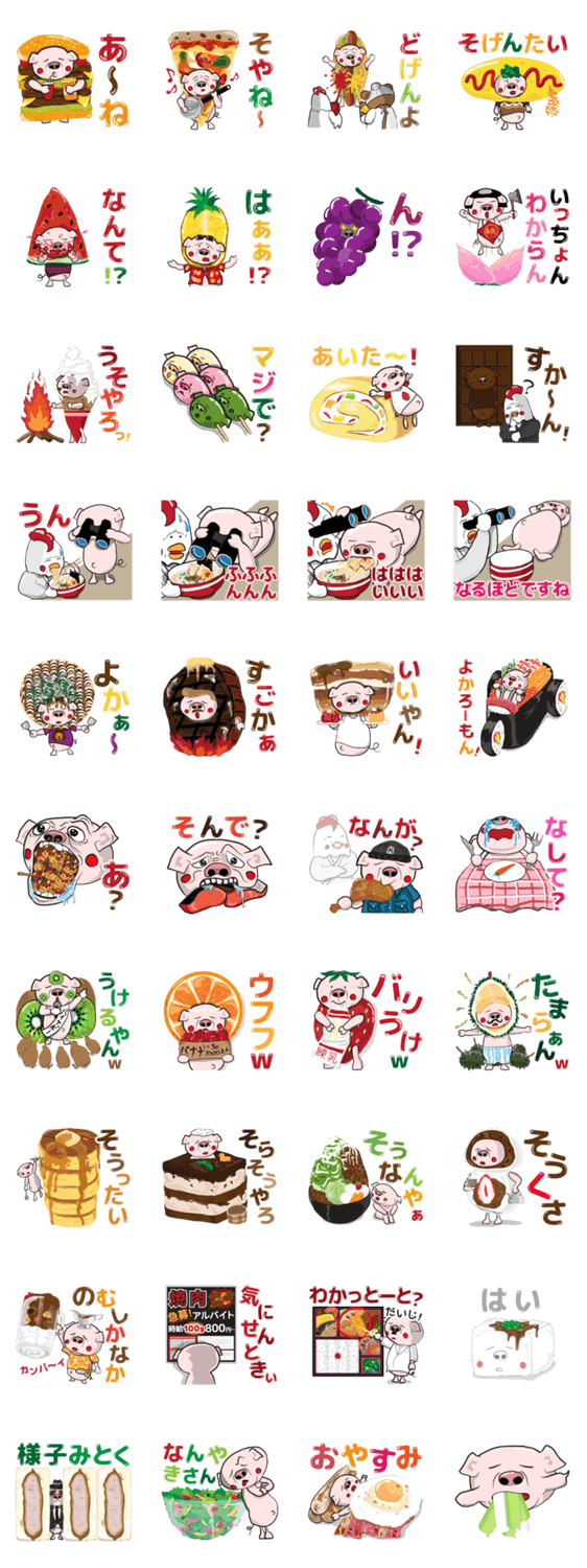 | スタンプ説明 | 三度のメシより三度以上のメシが好き、博多ぶたむすこの『相槌(あいづち)』向け"博多弁"スタンプ。ちょっとした返信、ソフトな飯テロにもどうぞ。 |