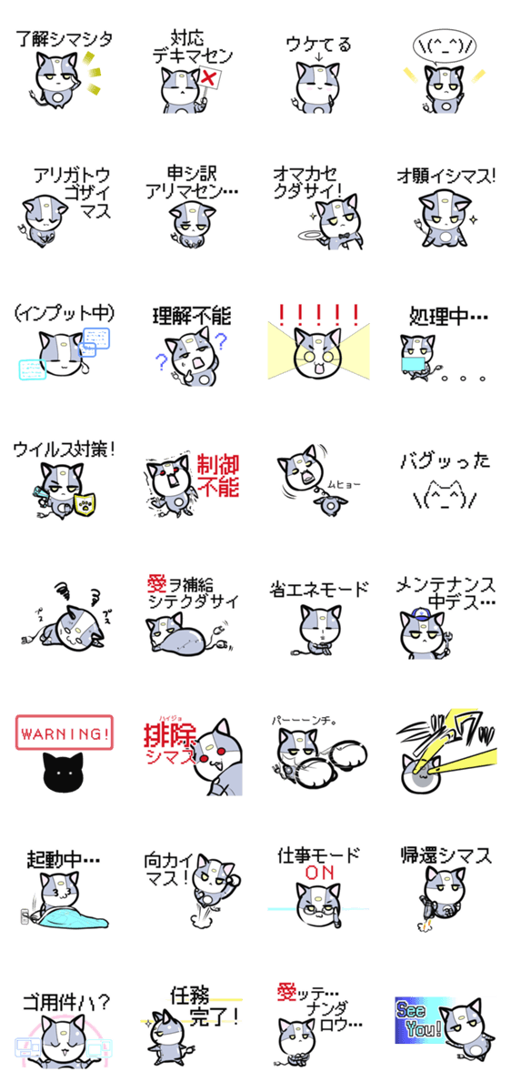 機械的なロボットネコのスタンプです。 感情表現が苦手な方におすすめ。