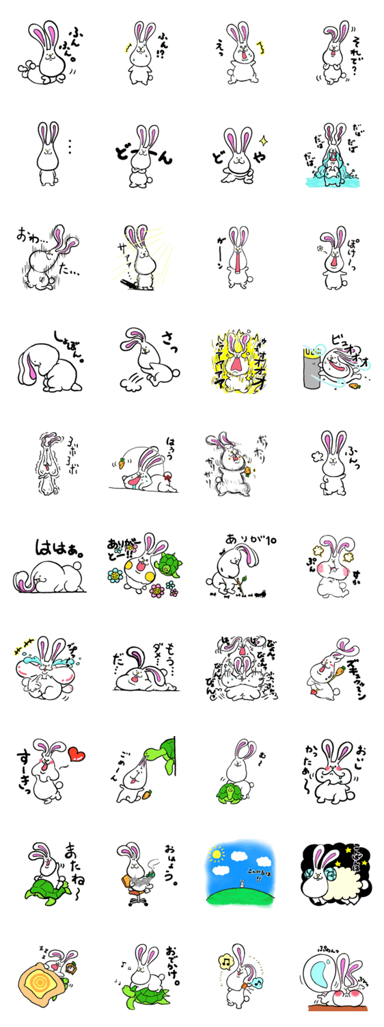 | スタンプ説明 | 名前はうさ本よしお。あだ名はうさもっちん。親友は亀のかめ吉。日常でお使い頂ける感情豊かなうさぎのスタンプです。 |