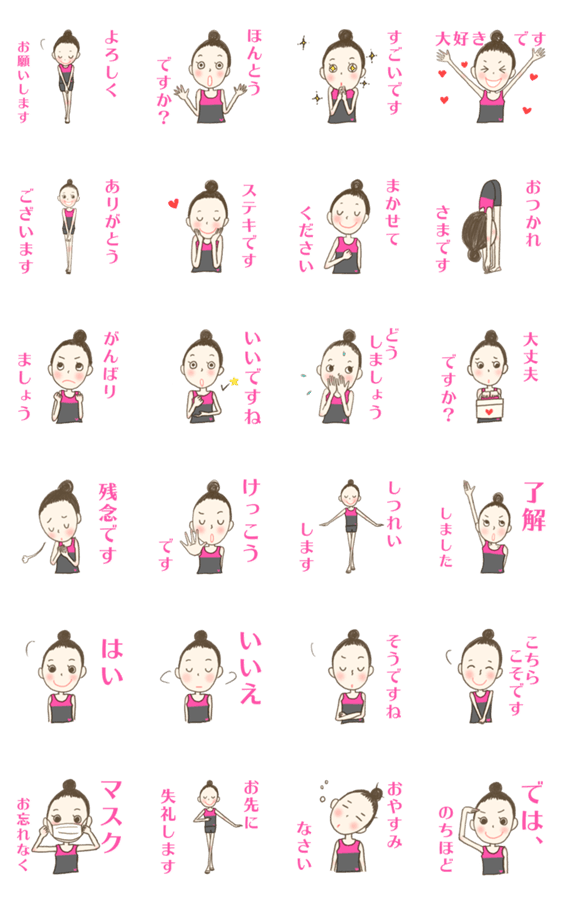 | スタンプ説明 | 新体操Girlシニヨンちゃんの敬語Vr.です。 新体操ガール・バレエガール・バトンガール・フィギアガール・チアガールなど、練習を頑張る可愛い女の子です。#初売りスタンプ |