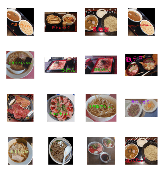 つけ麺、肉、うどん、そば、食べ物スタンプです。