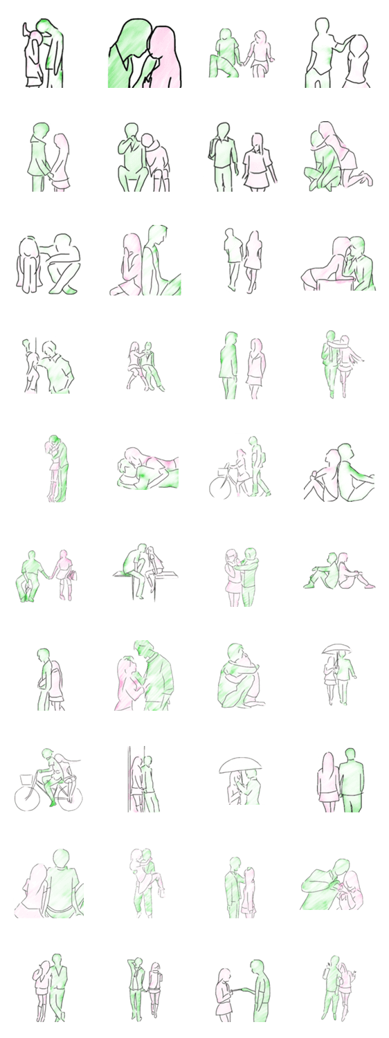 | スタンプ説明 | 学生カップル向けのイチャイチャ、ラブラブなシーンがスタンプに。二人っきりの甘酸っぱい思い出をシルエットで表現!壁ドン、頭ナデナデ、キス、ハグ、相合傘などあるよ。 |
